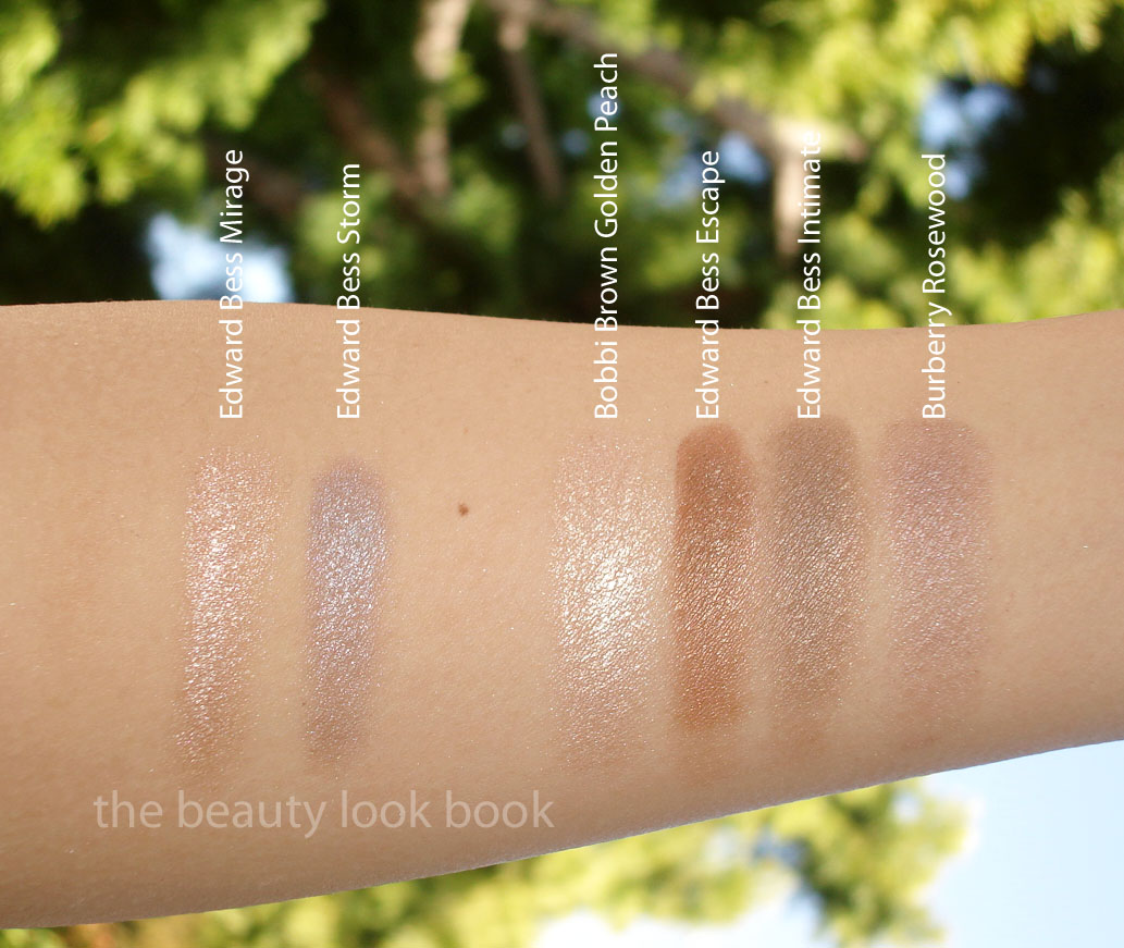 I have been eagerly waiting for the new eyeshadows Mirage and Storm to arrive from Edward Bess. Like many of his fans, I already own all his other shades in Nude, Intimate, Escape, Dusk, Night, Mystery (see here for swatches) along with both his trios Island Escape (here) and Soft Smoke (here) – all of which I get regular use out of. Those of you who have tried these know how luxurious, classic and naturally flattering they are. As much as I adore these, I have been looking forward to see something new. Gaia from The Non-Blonde and Charlestongirl from Best Things in Beauty satisfied my curiosity while I was waiting for these to arrive at my doorstep. Details, swatches and comparisons below.