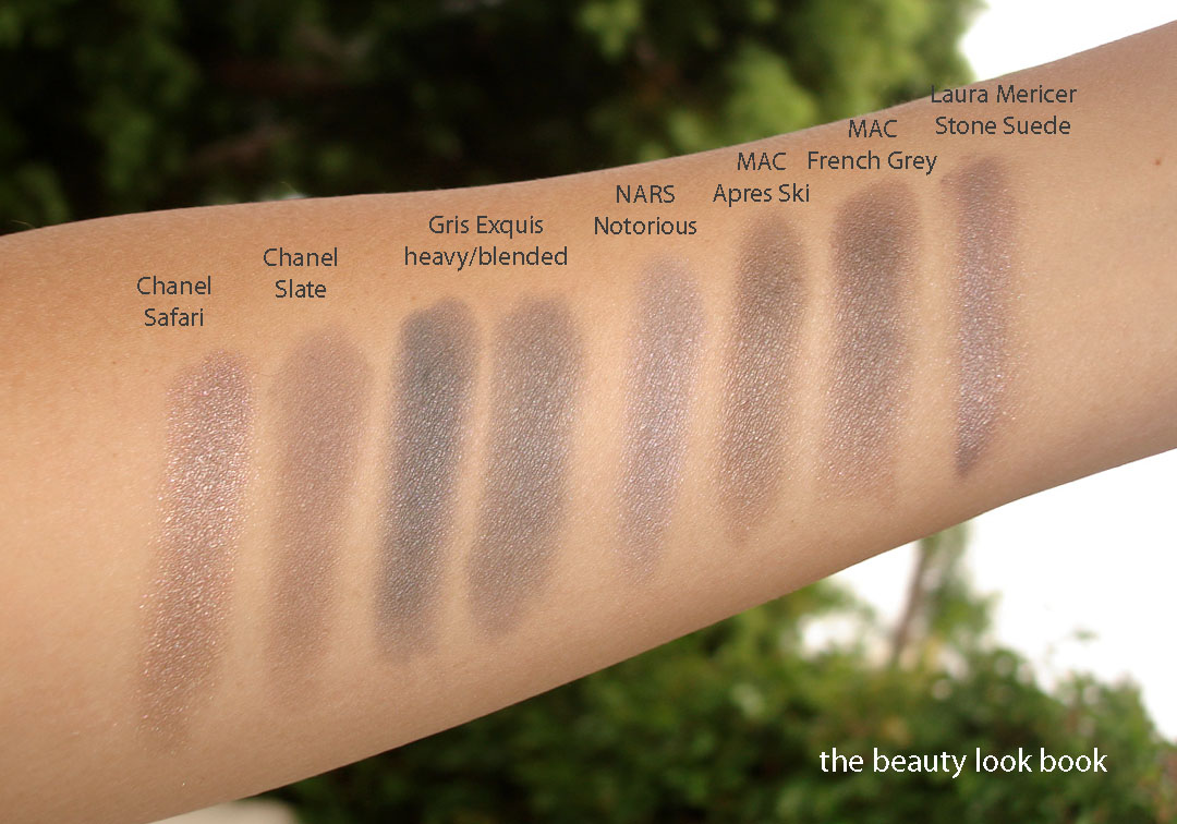 Looking at my collection of greys, I noticed that even my blue greys were not quite as blue as Gris Exquis for mattes. Here are some comparisons to others including Chanel Safari, Chanel Slate, Chanel Gris Exquis, NARS Notorious, MAC Apres Ski, MAC French Grey and Laura Mercier Stone Suede.