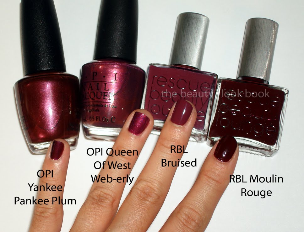 L to R: OPI Yankee Pankee Plum, OPI Queen of West Web-erly, RBL Bruised, RBL Moulin Rouge