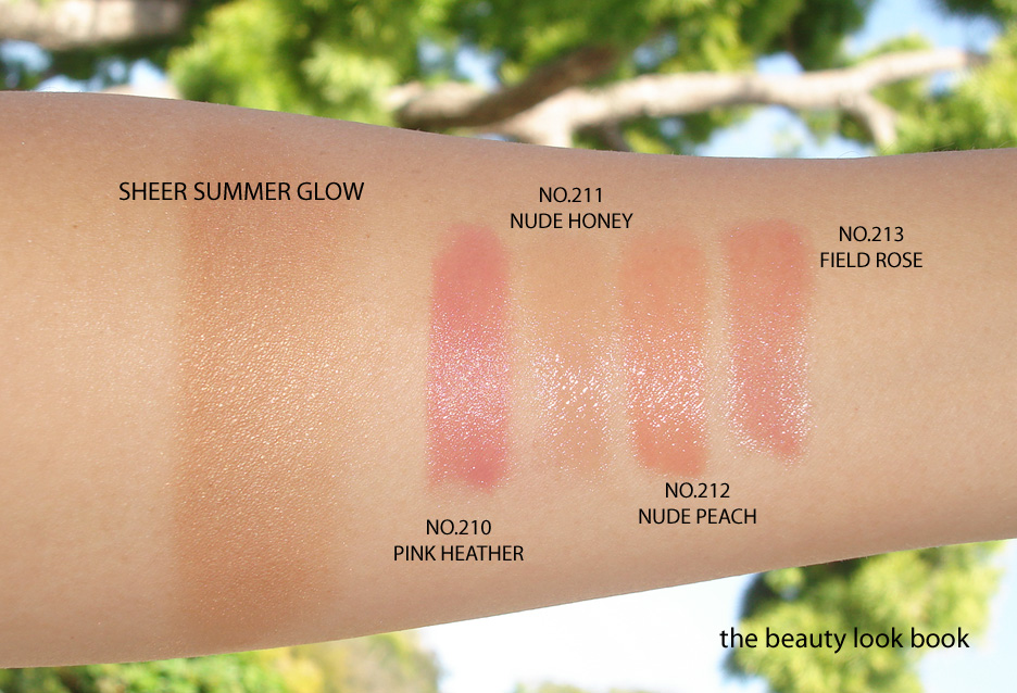 This summer Burberry Beauty has released a small collection featuring a new highlighter quad Sheer Summer Glow ($50) and four new shades of their sheer lipstick in the lip mist formula, 210 Pink Heather,211 Nude Honey, 212 Nude Peach, and 213 Field Rose ($30 each). The theme for the entire look is subtle nudes. Everything is extremely natural.